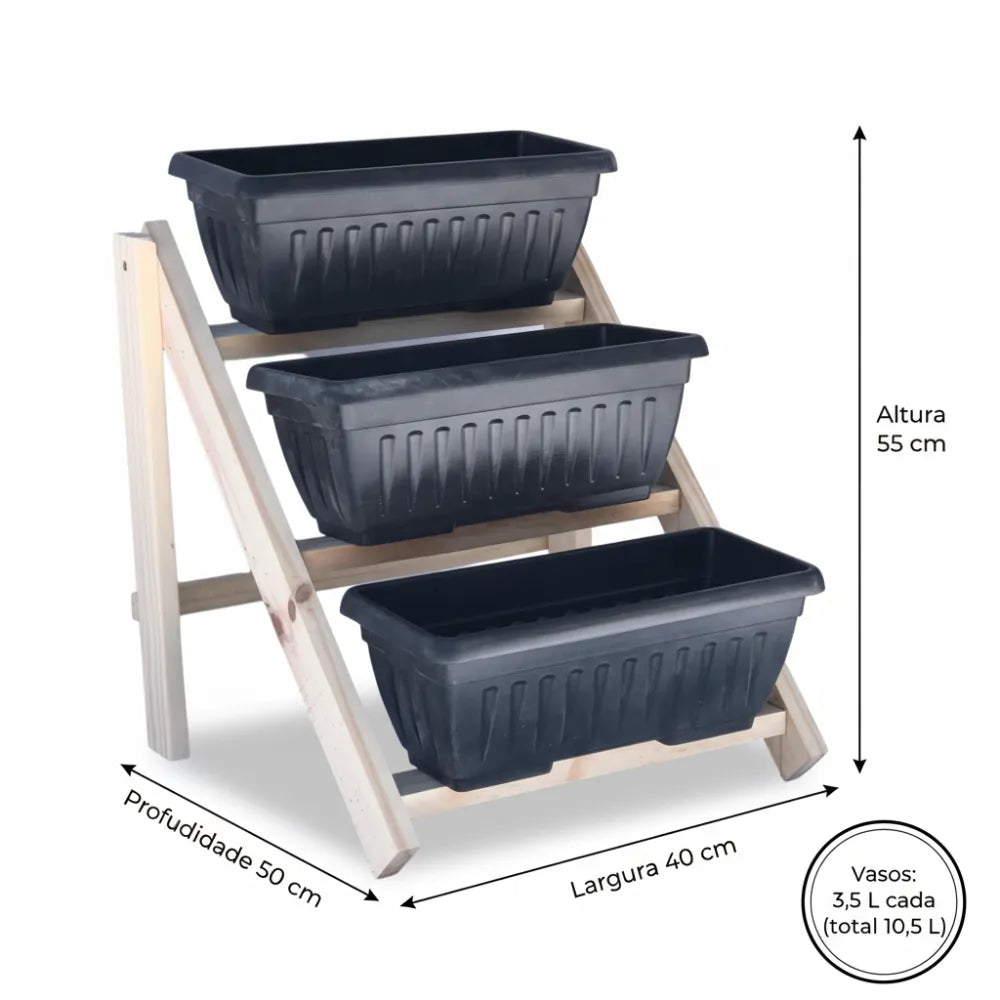 Três níveis que multiplicam sua área de plantio sem ocupar espaço no chão – perfeito para varandas, sacadas e áreas pequenas.